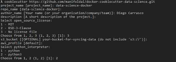 mkdir Docker-DataScience && cd Docker-DataSciencecookiecutter https://github.com/manifoldai/docker-cookiecutter-data-science.git
