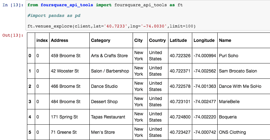 "source": "from foursquare_api_tools import foursquare_api_tools as ft\n\n#import pandas as pd\n\nft.venues_explore(client,lat='40.7233',lng='-74.0030',limit=100)"
